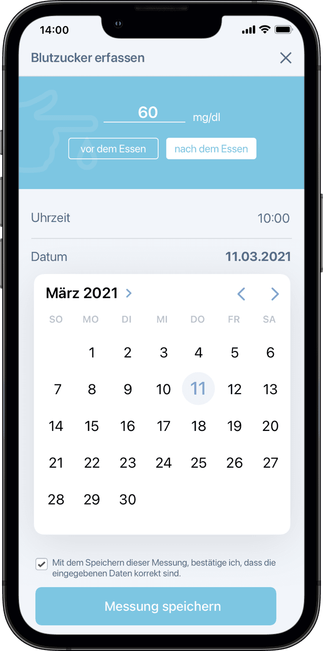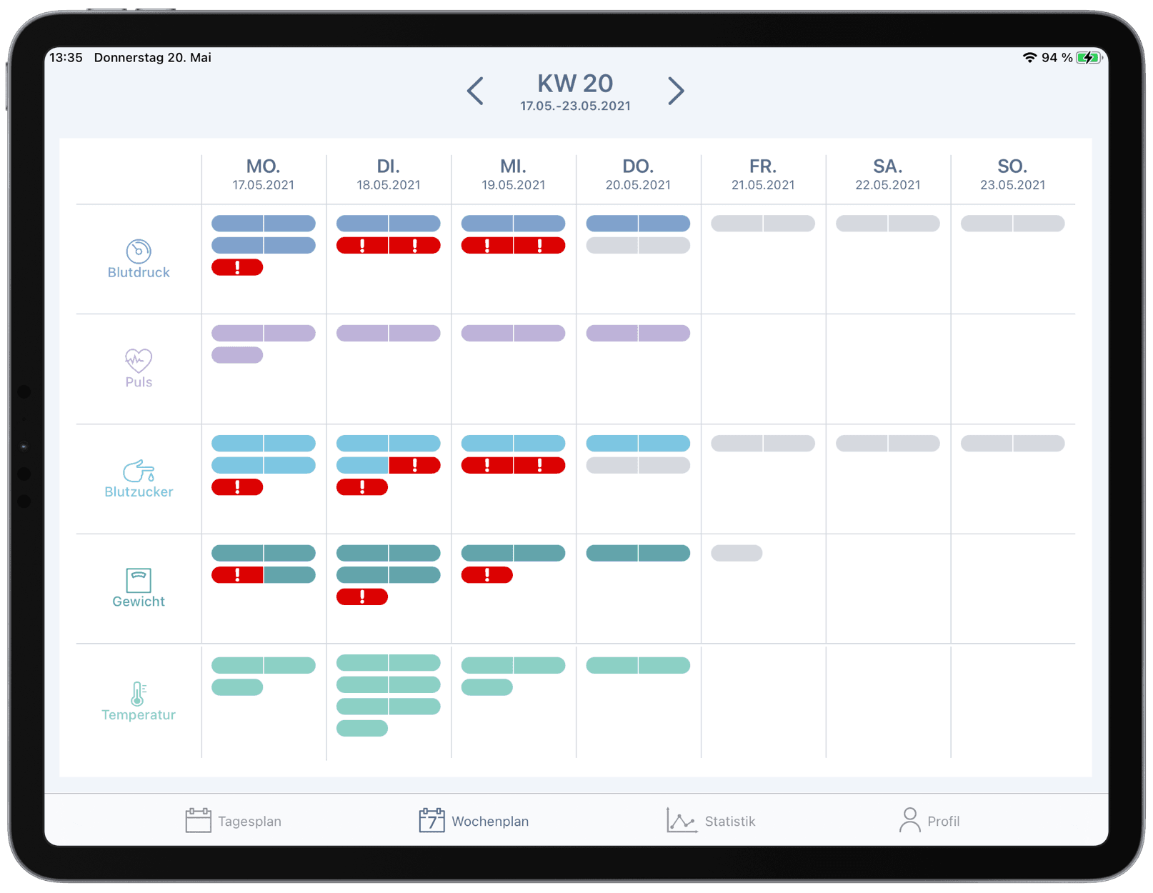 The daily schedule and the 3-day schedule provide an overview of all upcoming and recently performed measurements. Reminders through notifications ensure that no scheduled measurements or medication intake are forgotten. The app also offers a clear and configurable display of all data.