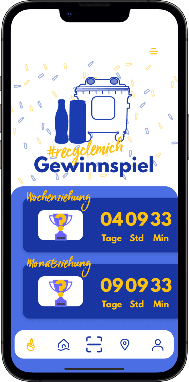After the user has registered in the app, he or she can take a photo of the yellow garbage can or bag that is intended for disposal. The user then scans the barcode of the plastic packaging or aluminum can and disposes of it in the previously scanned bin. Points are awarded for each item recycled. The commitment to the environment is rewarded with the chance to win great prizes. An overview of the points already collected can be found on the home screen. This makes it clear at a glance what users have already contributed to protecting the environment.