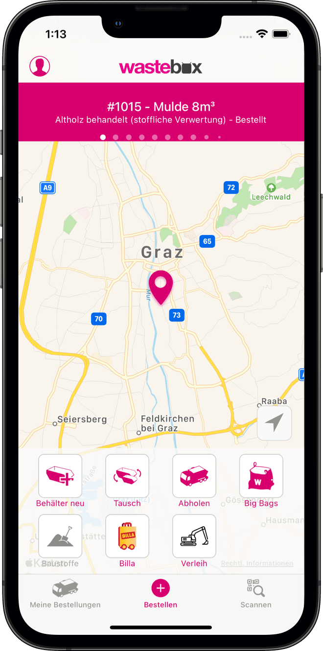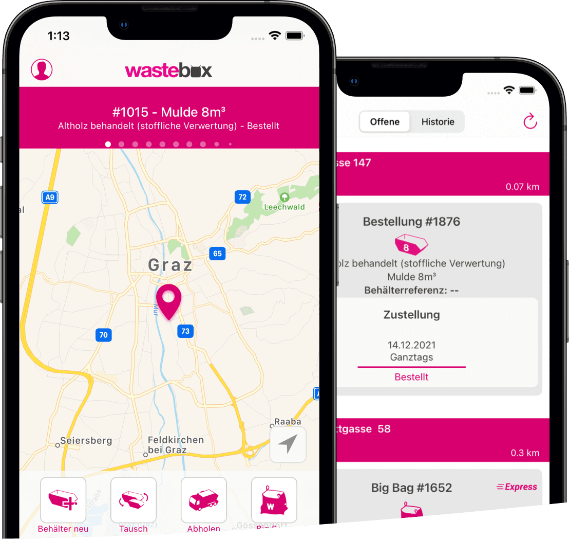 With the Wastebox.biz app, containers for the removal of commercial waste can be ordered quickly and easily by connecting construction companies and waste disposal companies in real time and directly with each other.