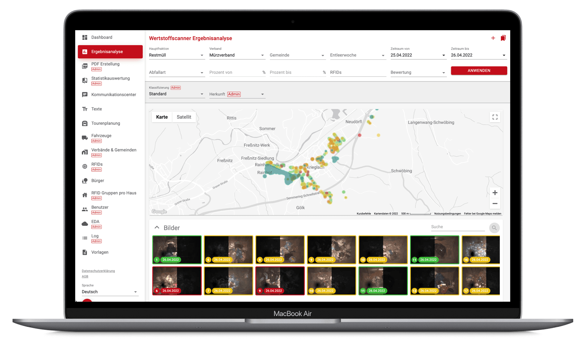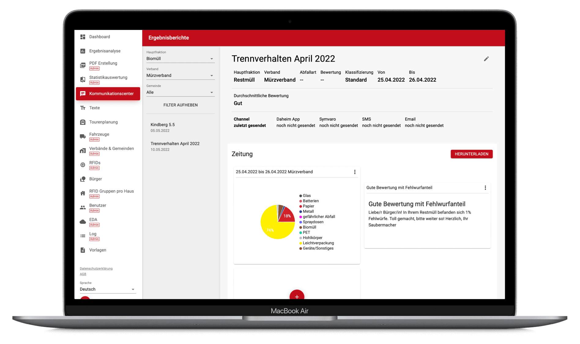 On the platform, a communication tool makes it possible to give disposal companies, partners and citizens access to the "Smart Waste" data. In addition, individual reports on waste generation, material distribution and separation rates can be provided and broken down to individual neighborhoods, zones and streets.